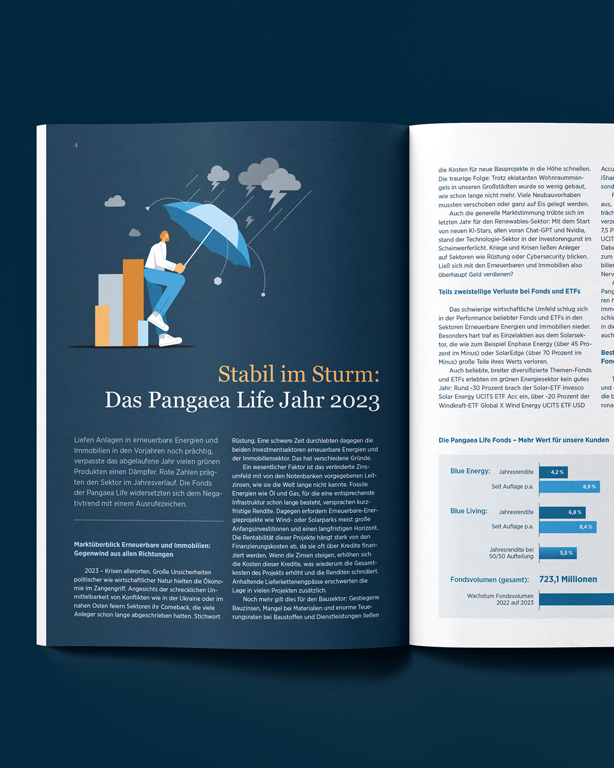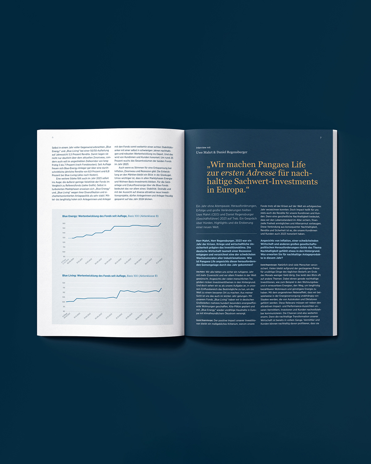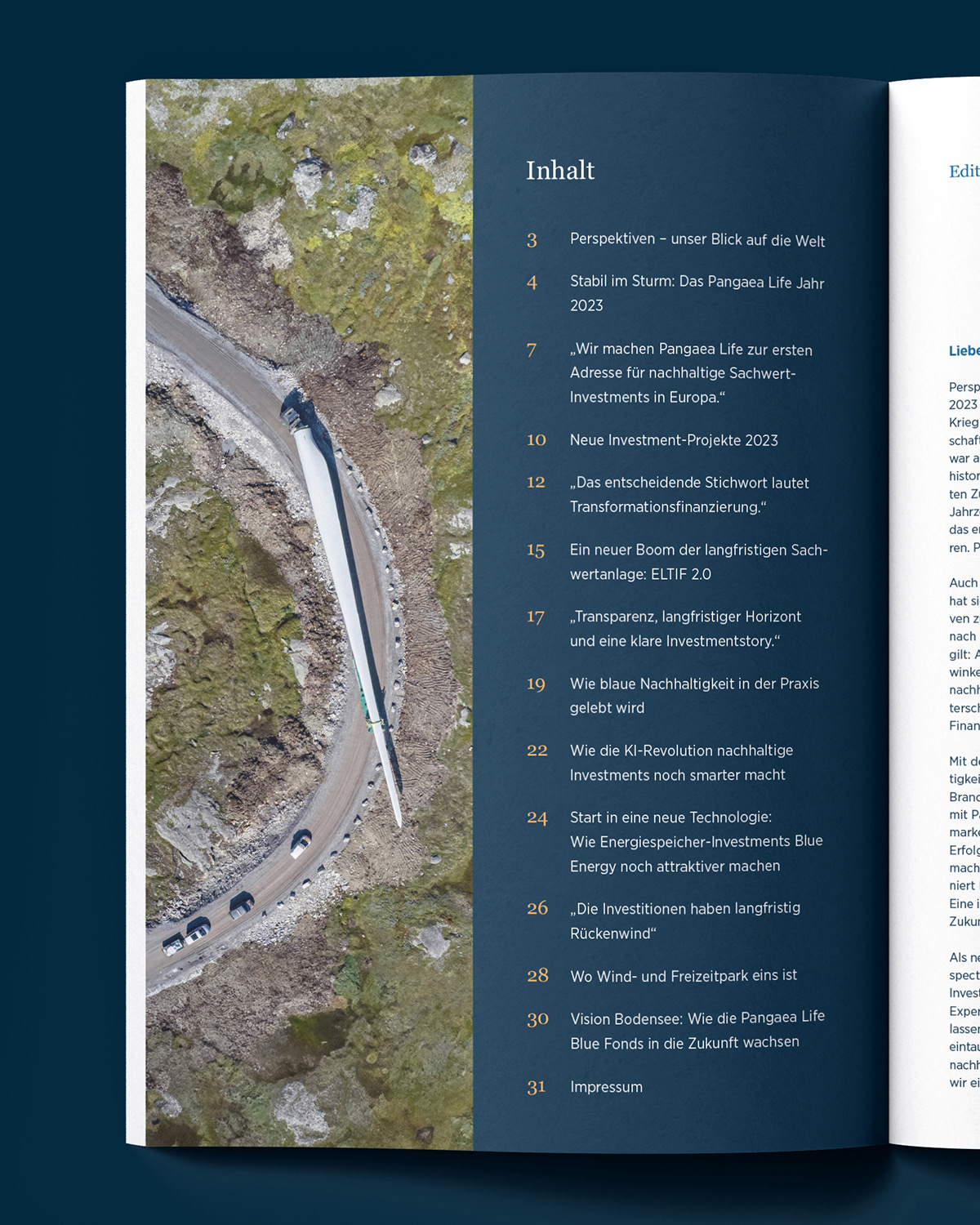 Editorial Design für die erste Ausgabe des neuen Jahresmagazins »Blue Perspectives 2024« von Pangaea Life, einer Versicherungsgesellschaft mit Fokus auf nachhaltige Investments. Das Magazin zeigt Rück- und Ausblicke zum nachhaltigen Investieren und beschäftigt sich mit den Trends, Chancen und Visionen in der Finanzbranche.