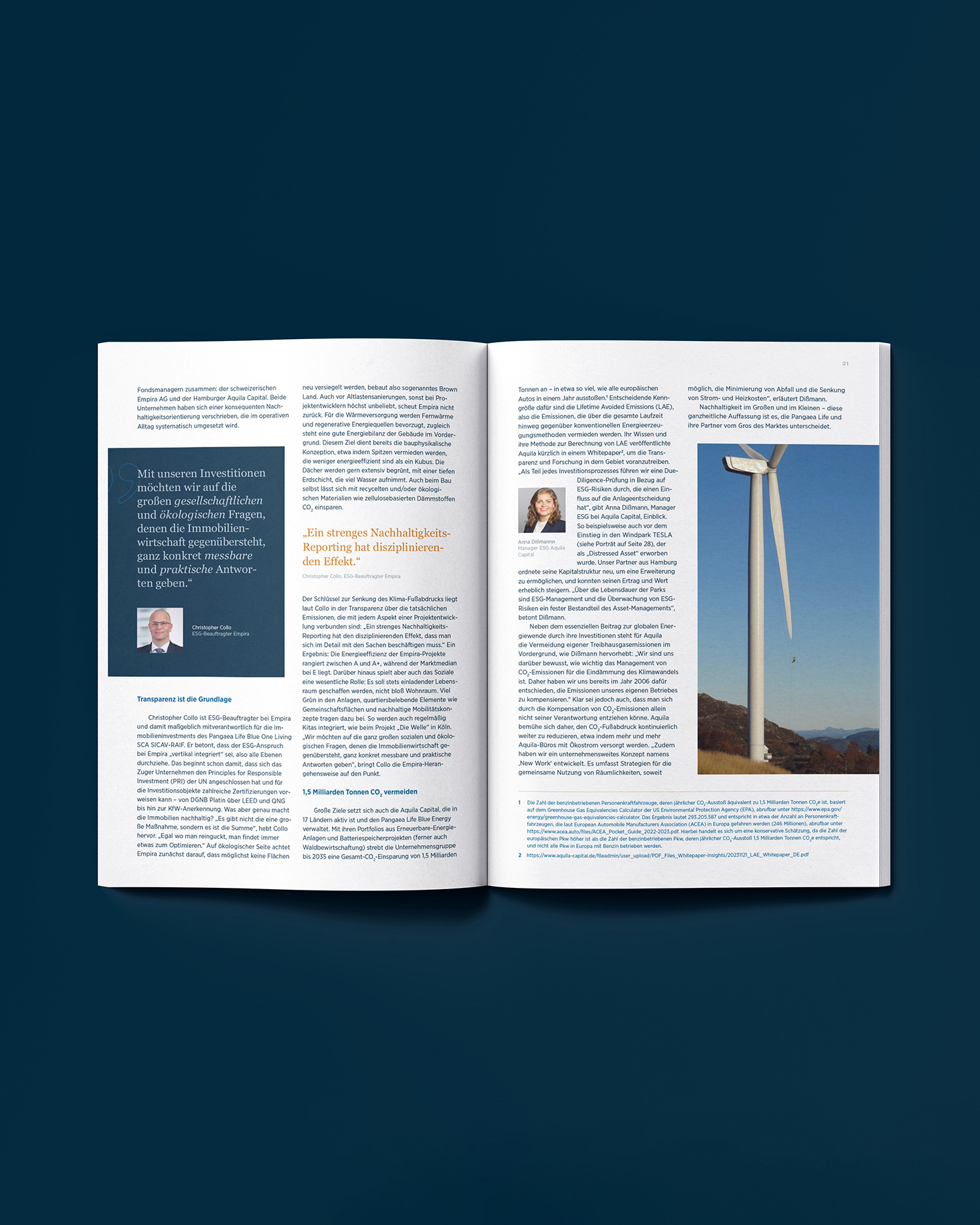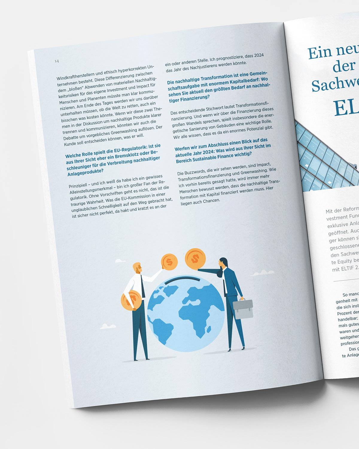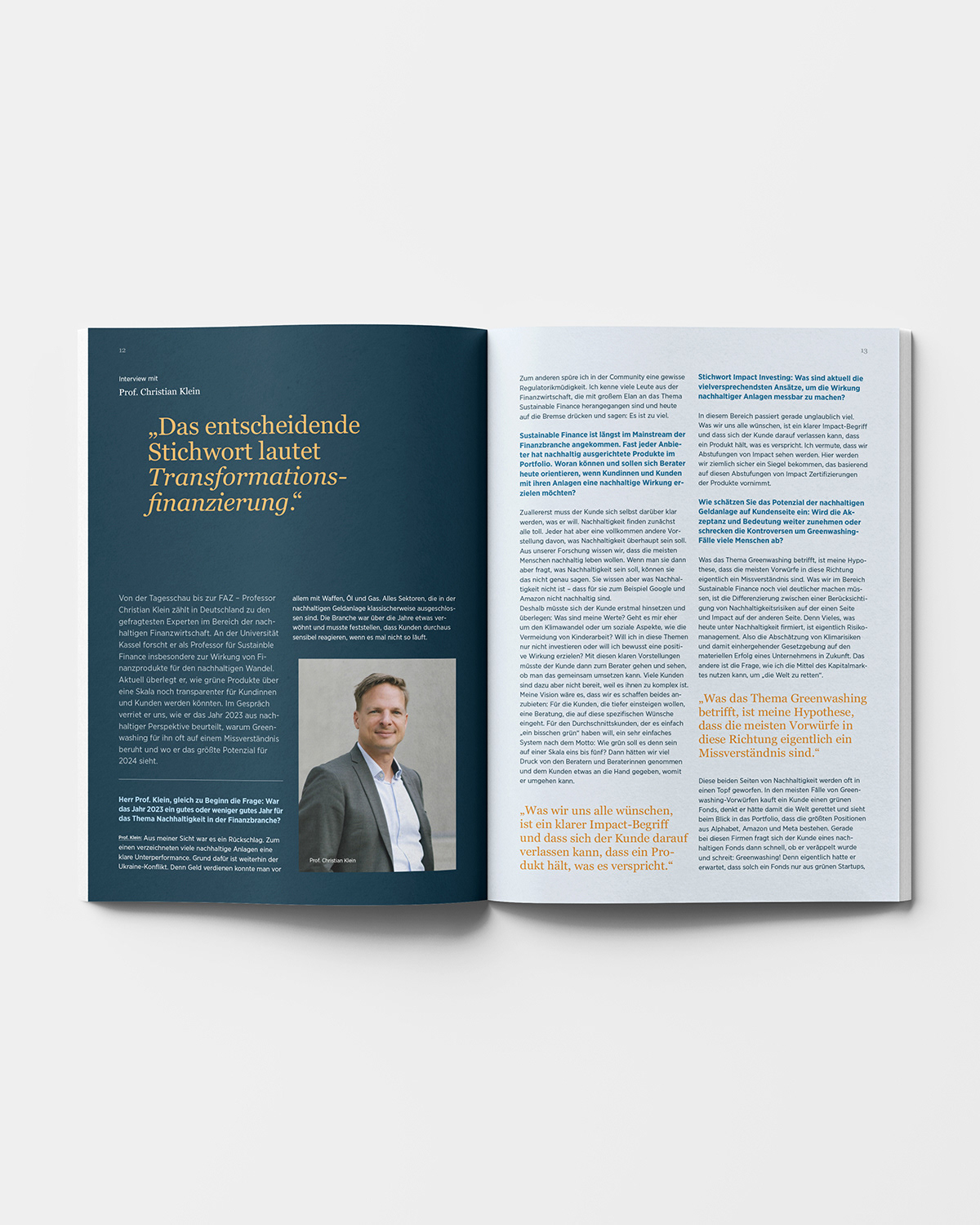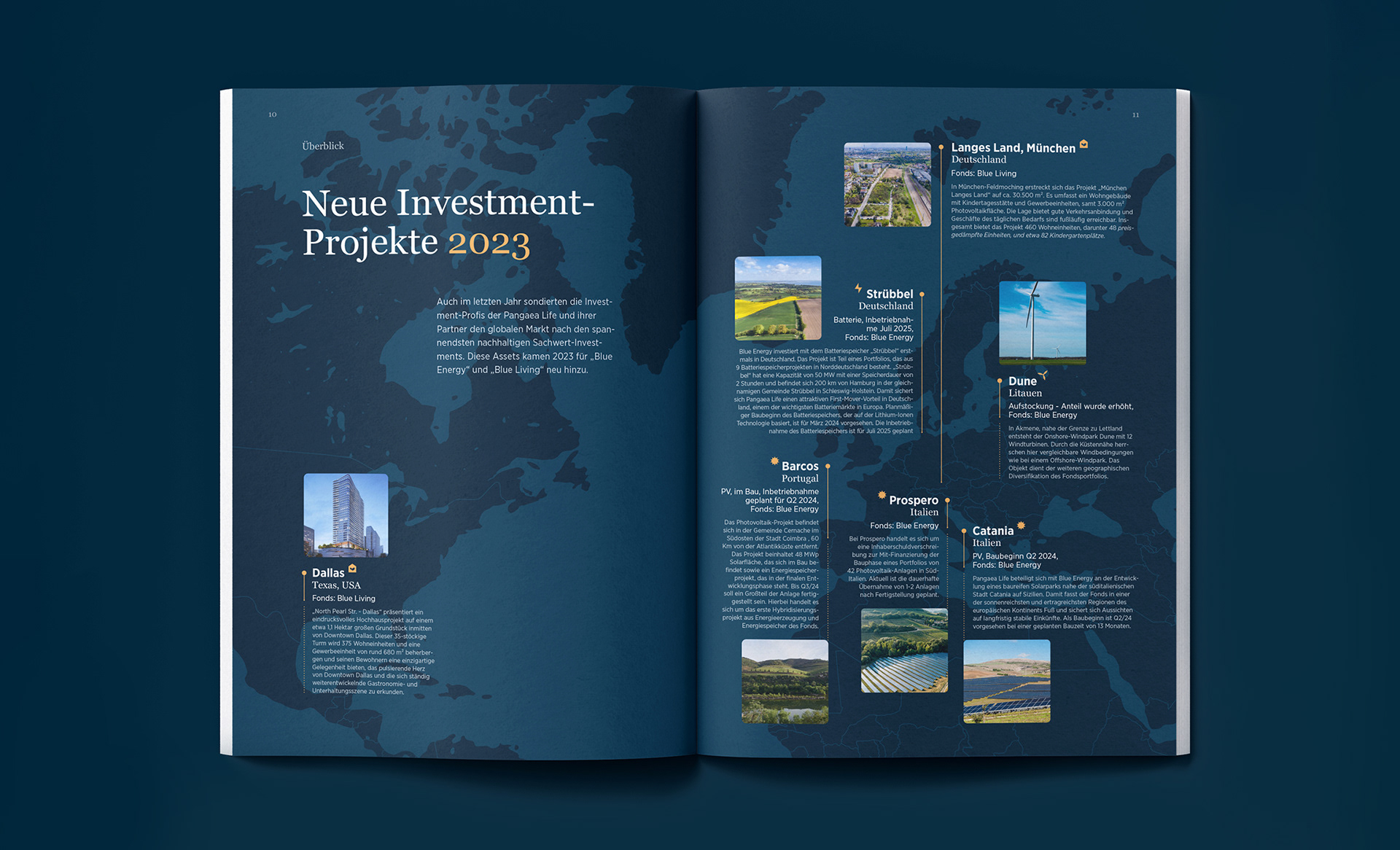 Editorial Design für die erste Ausgabe des neuen Jahresmagazins »Blue Perspectives 2024« von Pangaea Life, einer Versicherungsgesellschaft mit Fokus auf nachhaltige Investments. Das Magazin zeigt Rück- und Ausblicke zum nachhaltigen Investieren und beschäftigt sich mit den Trends, Chancen und Visionen in der Finanzbranche.
