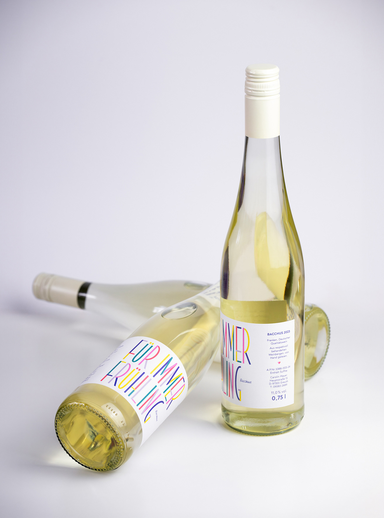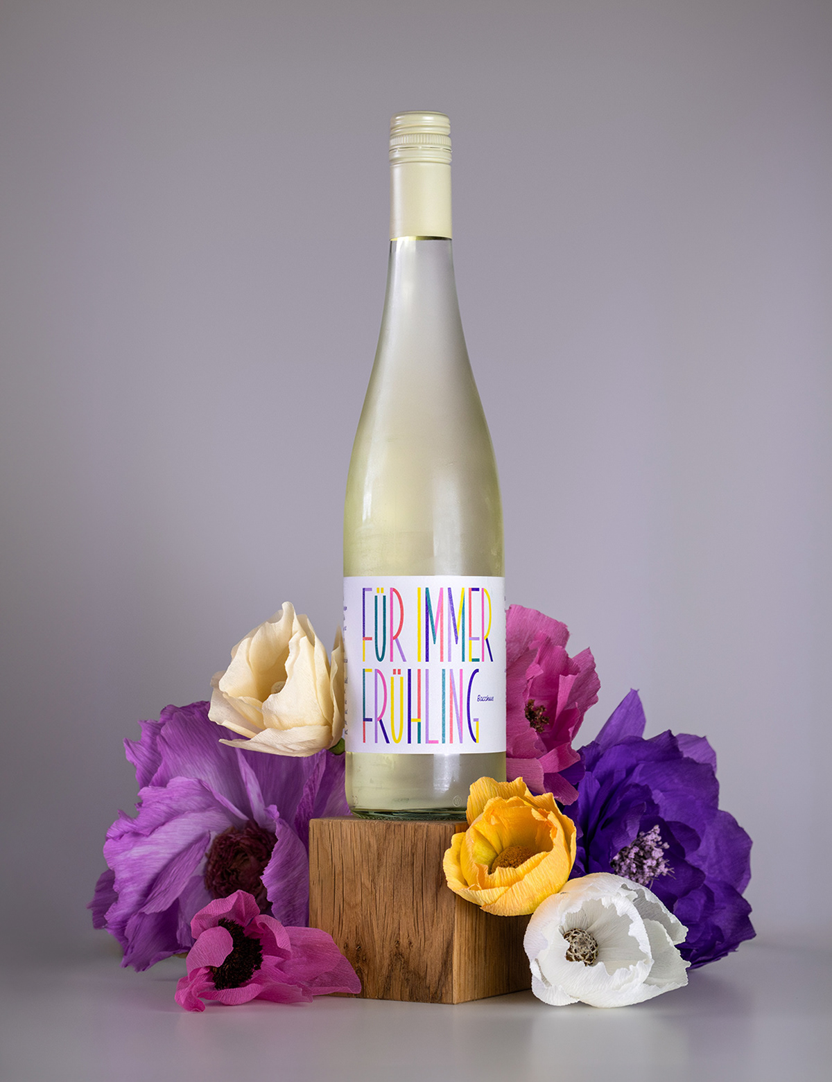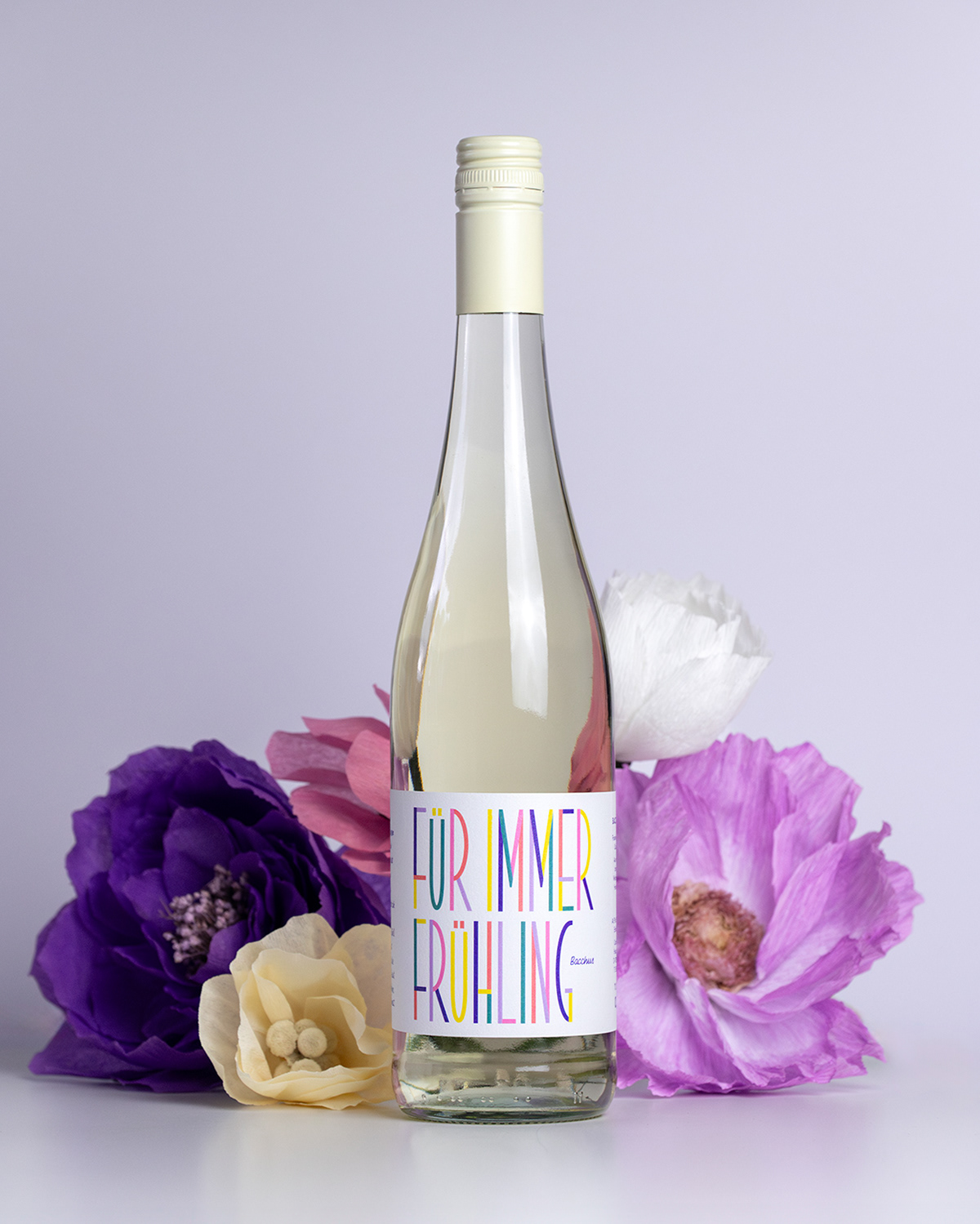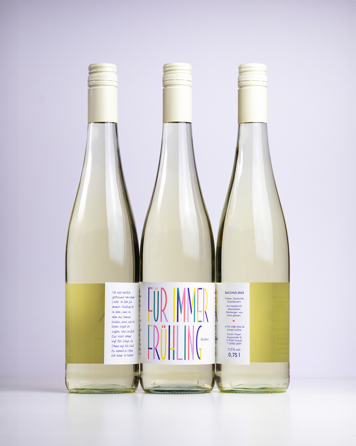 Frühling in der Flasche – und auf dem Etikett. Dieses Etikettendesign entstand für den frischen Bacchus von Carolin Meyer im Frühling 2024. Der Titel »Für immer Frühling«, der in Anlehnung an den Song von »Soffie« gewählt wurde, ist hierfür in handgemachter Typografie und leuchtenden Farben umgesetzt worden. Außerdem finden sich neben dem Titel auch einige Textzeilen des Songs auf dem Etikett wieder, welche die frühlingshafte Anmutung des Weins aufgreifen.