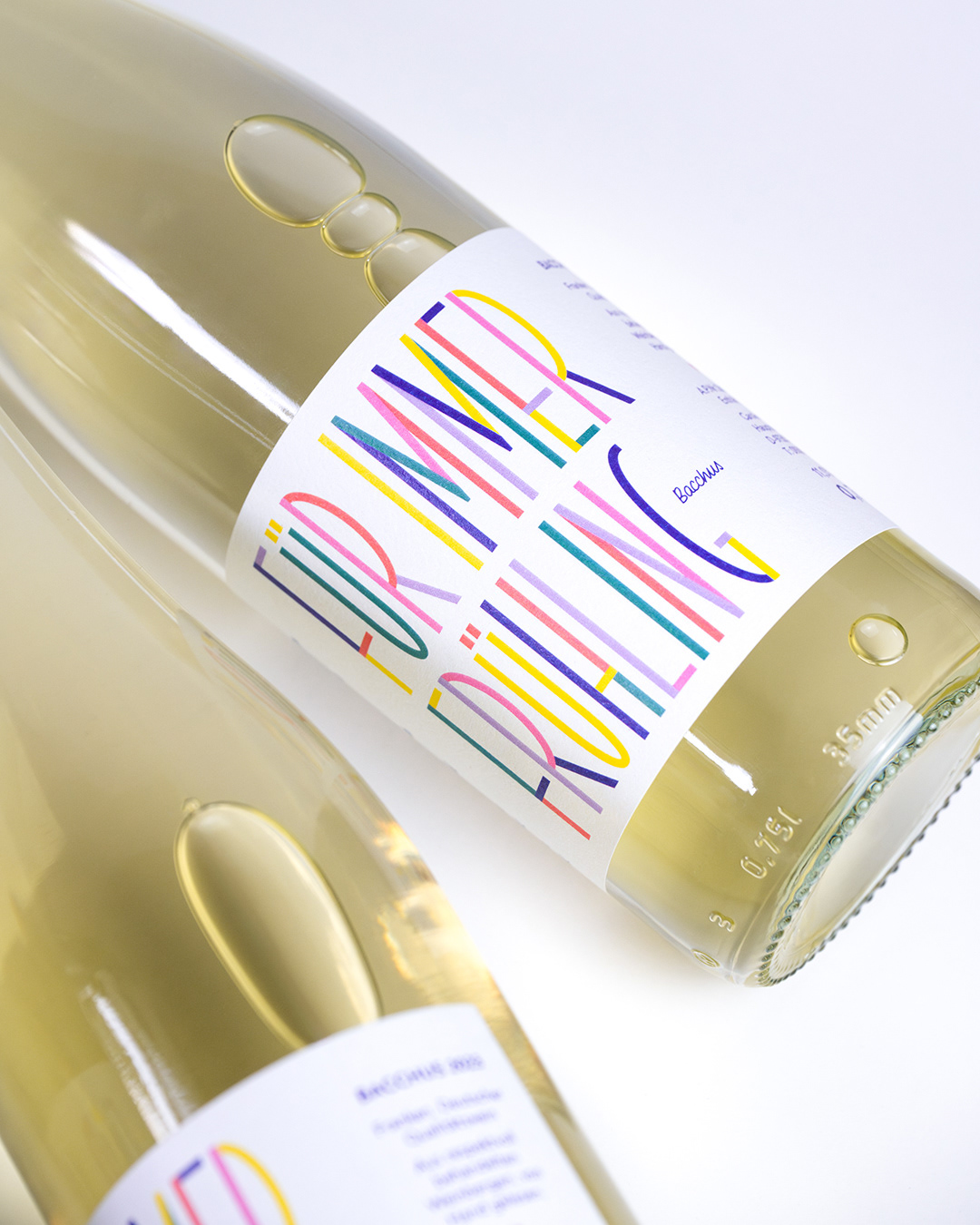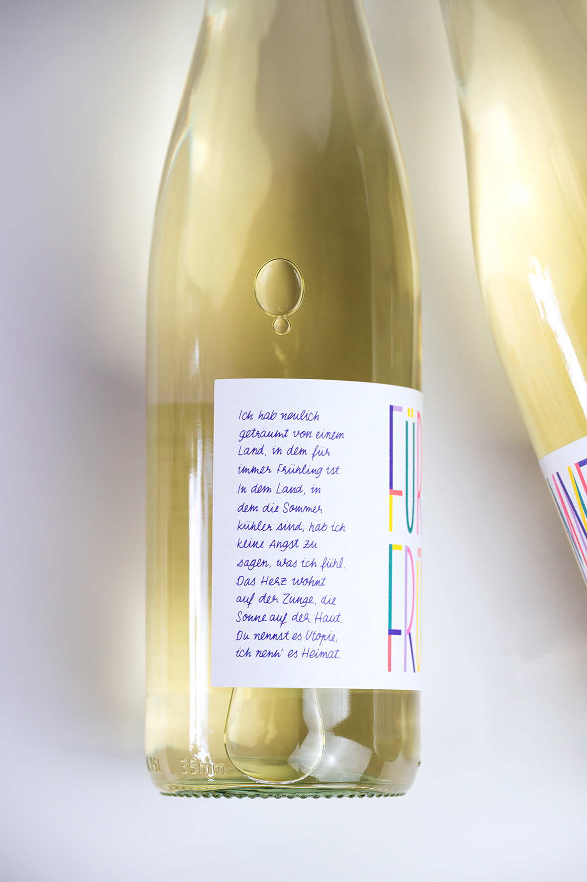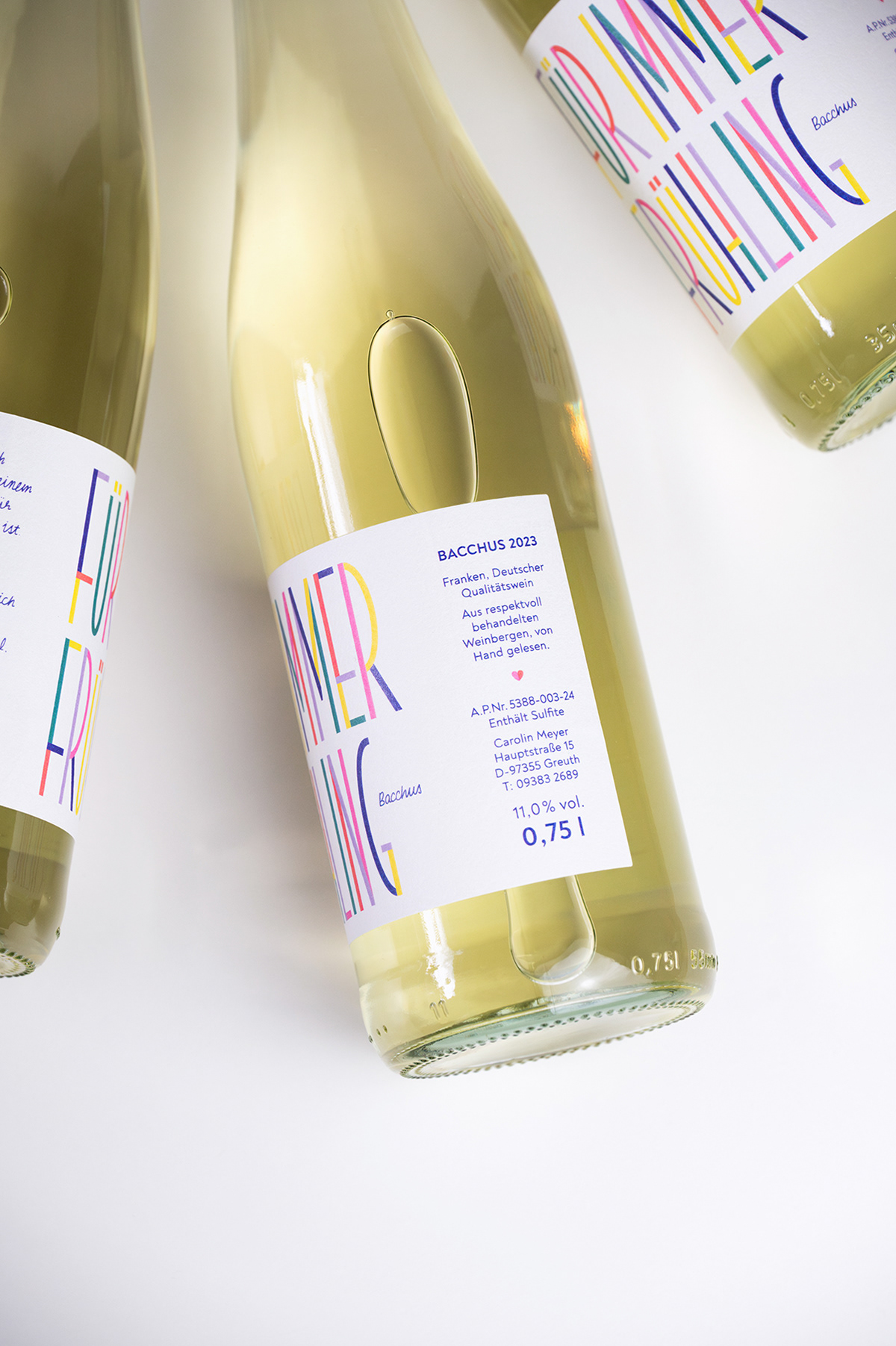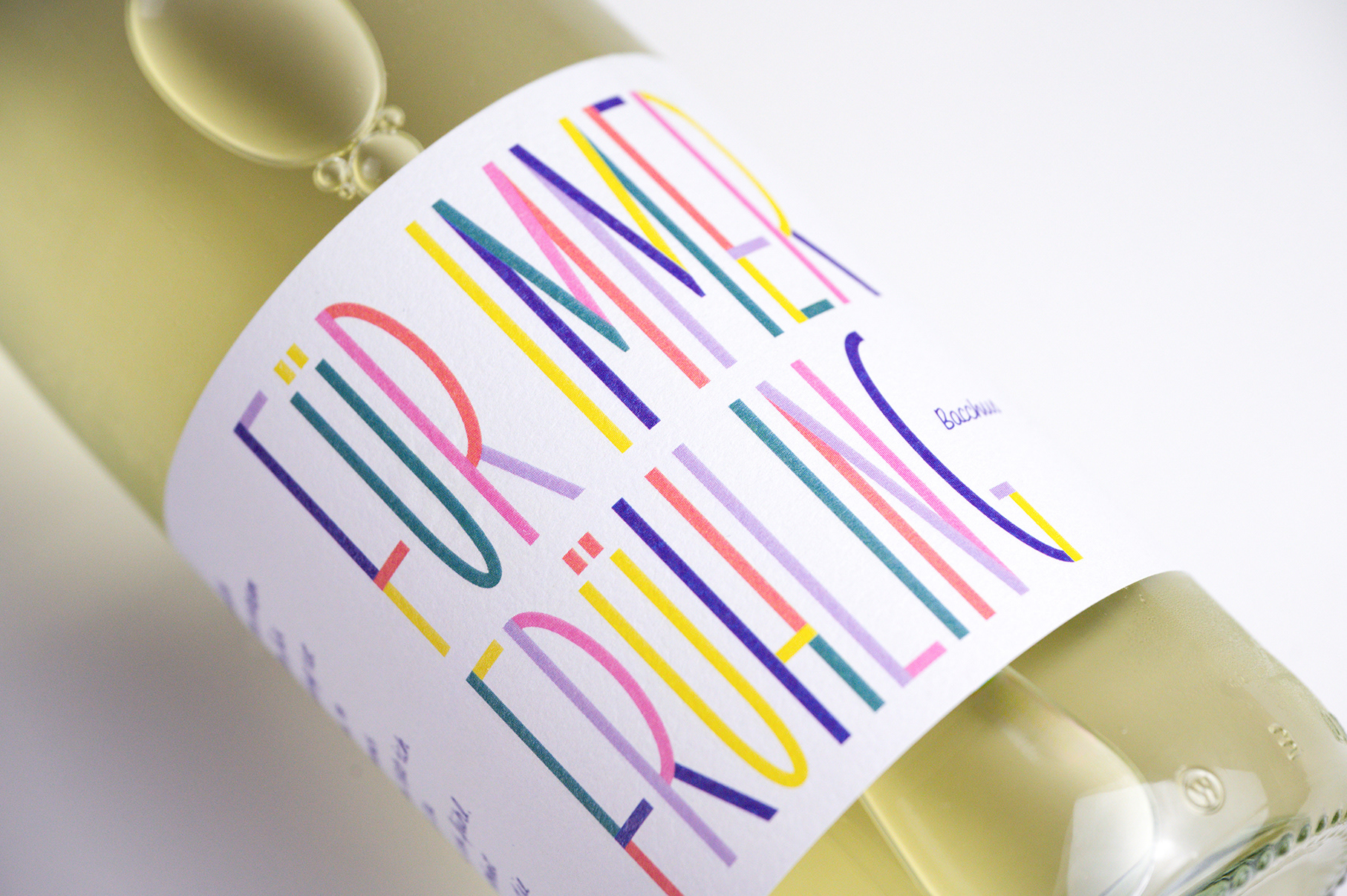Frühling in der Flasche – und auf dem Etikett. Dieses Etikettendesign entstand für den frischen Bacchus von Carolin Meyer im Frühling 2024. Der Titel »Für immer Frühling«, der in Anlehnung an den Song von »Soffie« gewählt wurde, ist hierfür in handgemachter Typografie und leuchtenden Farben umgesetzt worden. Außerdem finden sich neben dem Titel auch einige Textzeilen des Songs auf dem Etikett wieder, welche die frühlingshafte Anmutung des Weins aufgreifen.