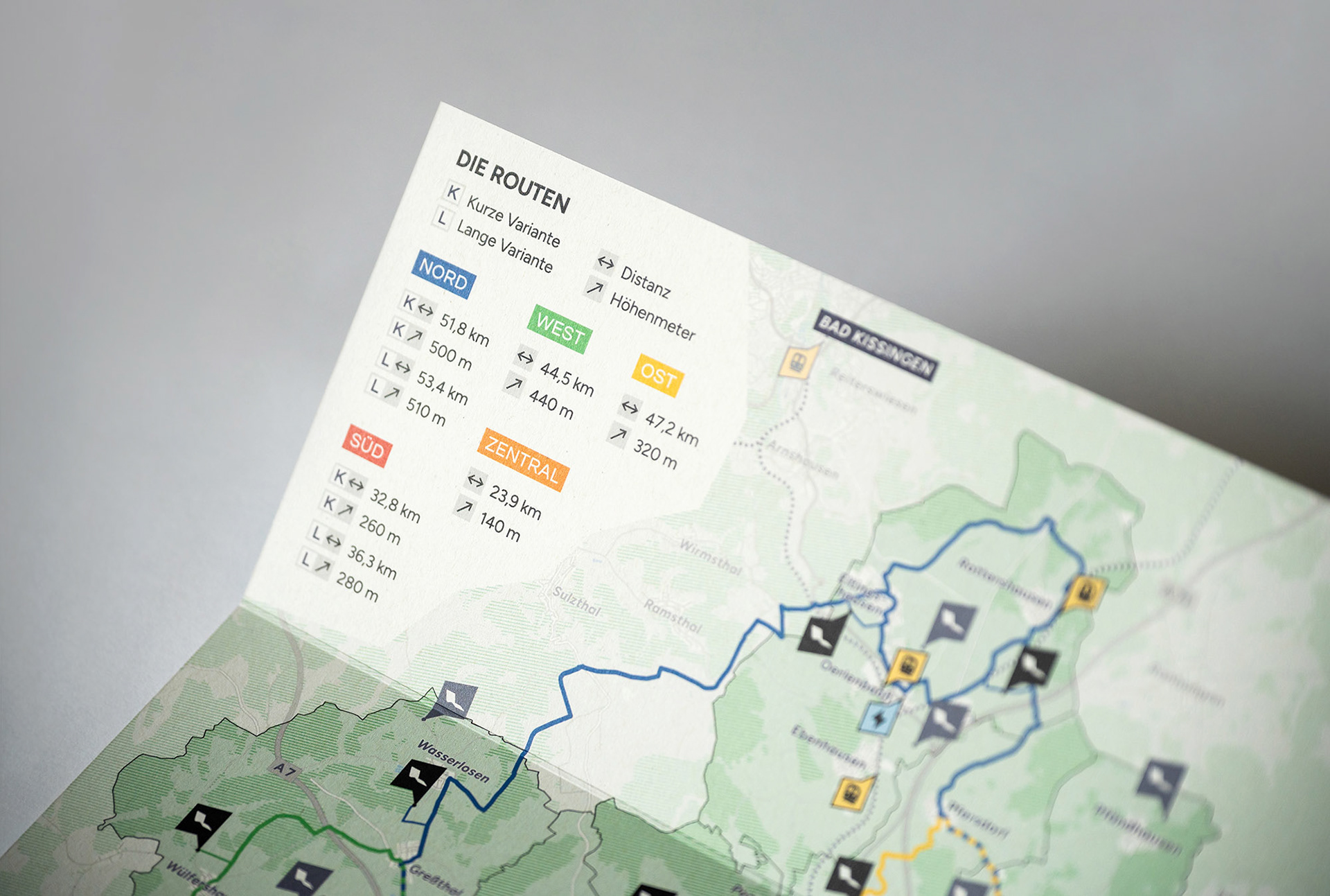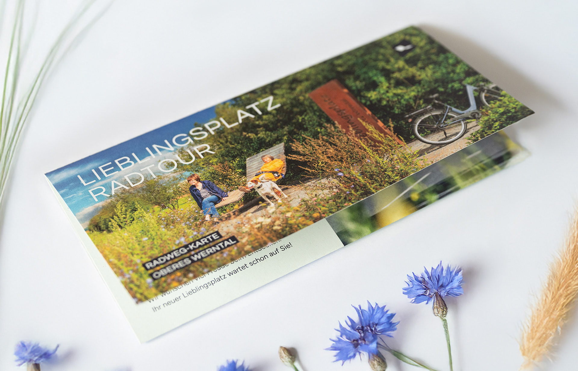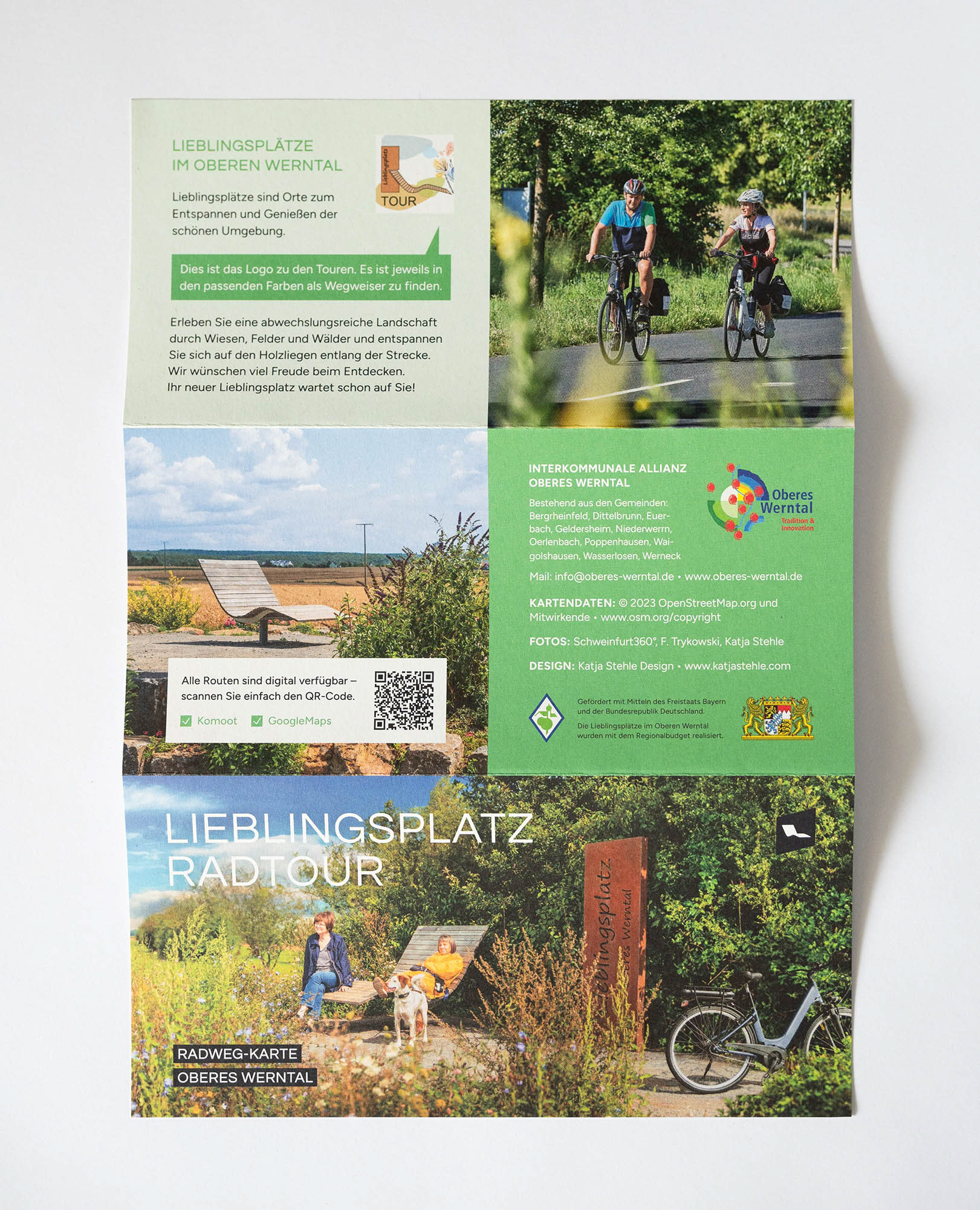 Gestaltung einer übersichtlichen Radtour-Karte, welche die Standorte der sogenannten »Lieblingsplätze« in der Region Oberes Werntal zeigt. Offizielle Radtouren verbinden diese Orte miteinander und laden Besucher ein, die malerische Landschaft zu genießen. Neben dem Fotografieren einiger Lieblingsplätze wurden außerdem alle Routen von mir in Google Maps und Komoot integriert, um auch digital eine einfache Navigation zu ermöglichen.
