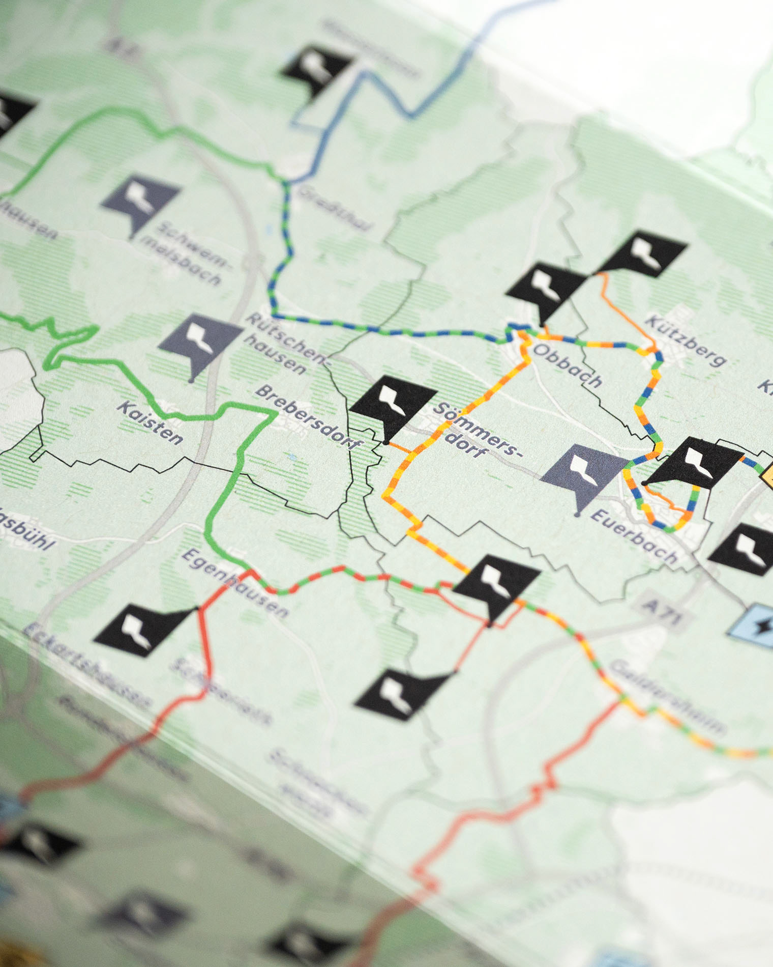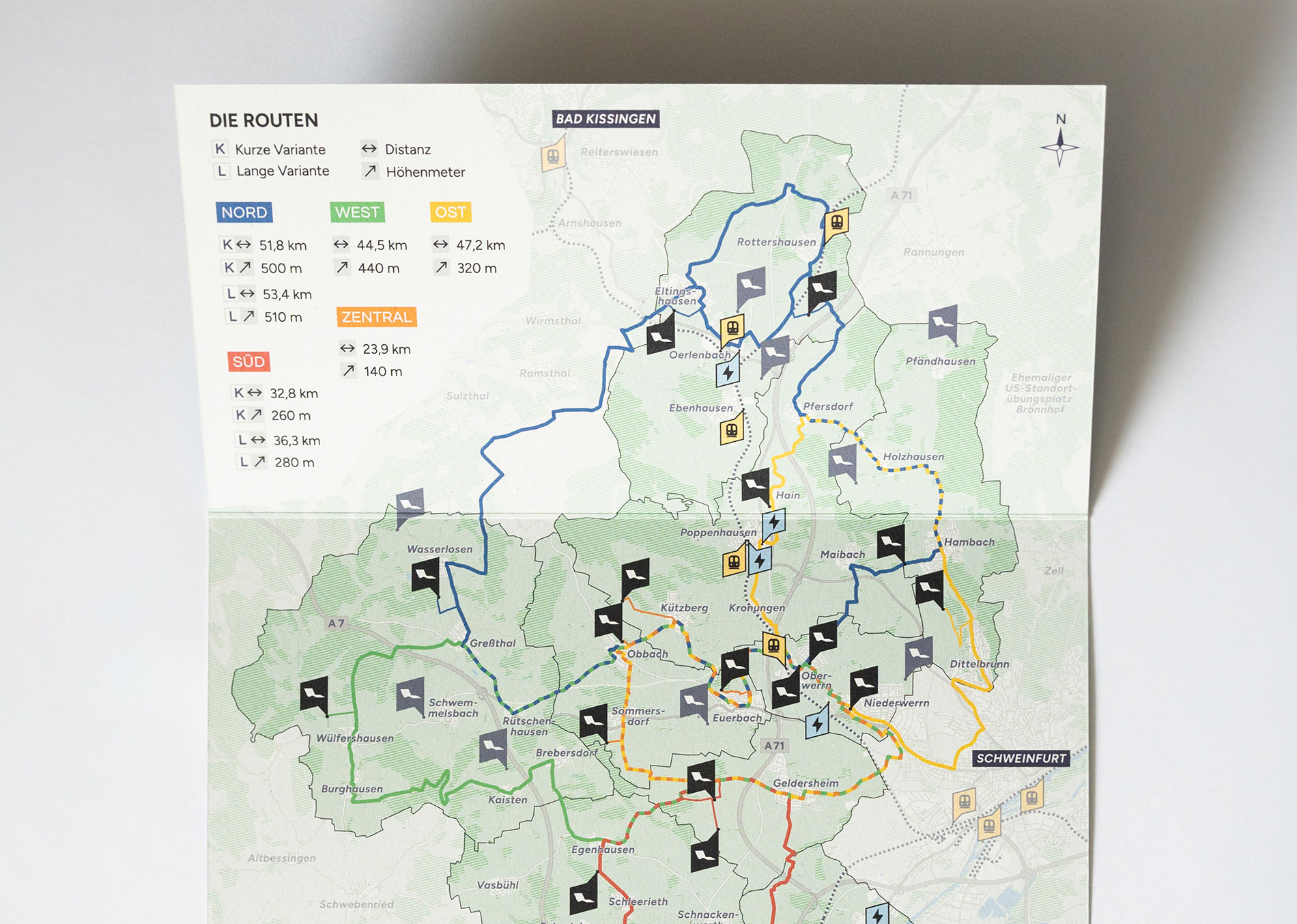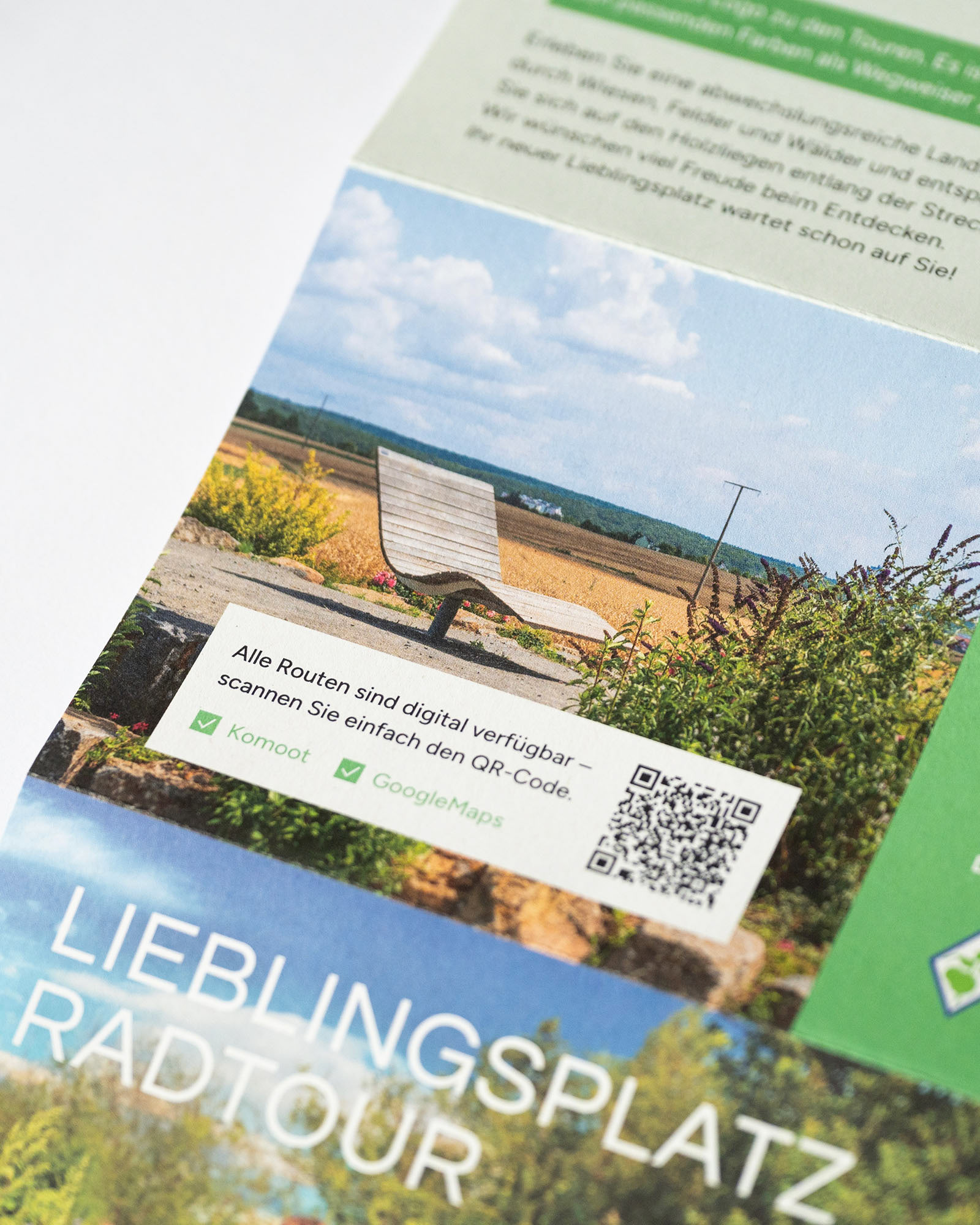 Gestaltung einer übersichtlichen Radtour-Karte, welche die Standorte der sogenannten »Lieblingsplätze« in der Region Oberes Werntal zeigt. Offizielle Radtouren verbinden diese Orte miteinander und laden Besucher ein, die malerische Landschaft zu genießen. Neben dem Fotografieren einiger Lieblingsplätze wurden außerdem alle Routen von mir in Google Maps und Komoot integriert, um auch digital eine einfache Navigation zu ermöglichen.