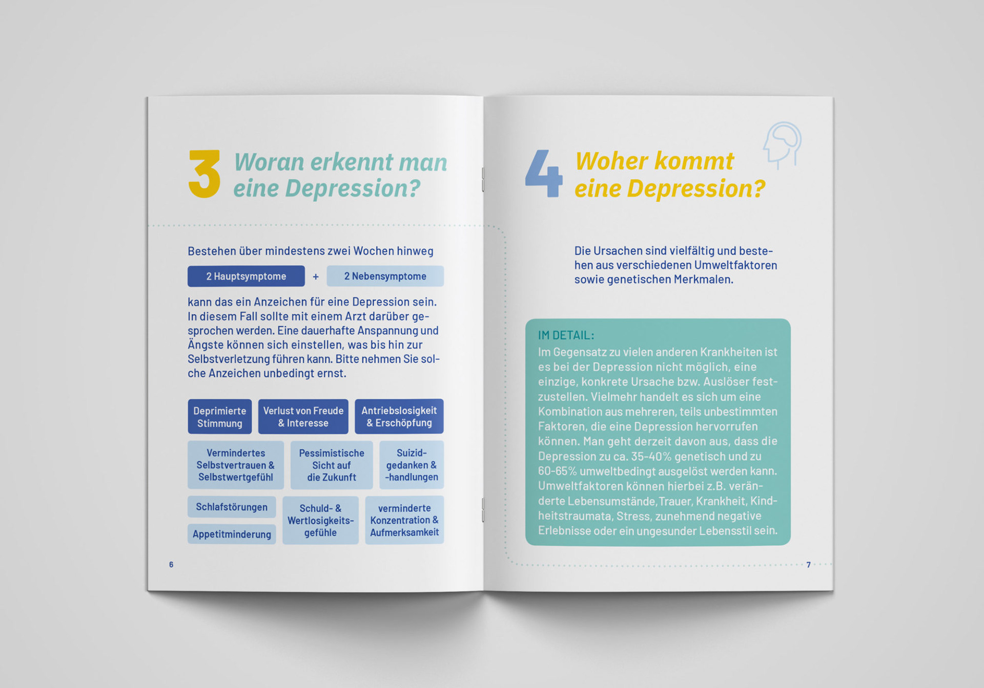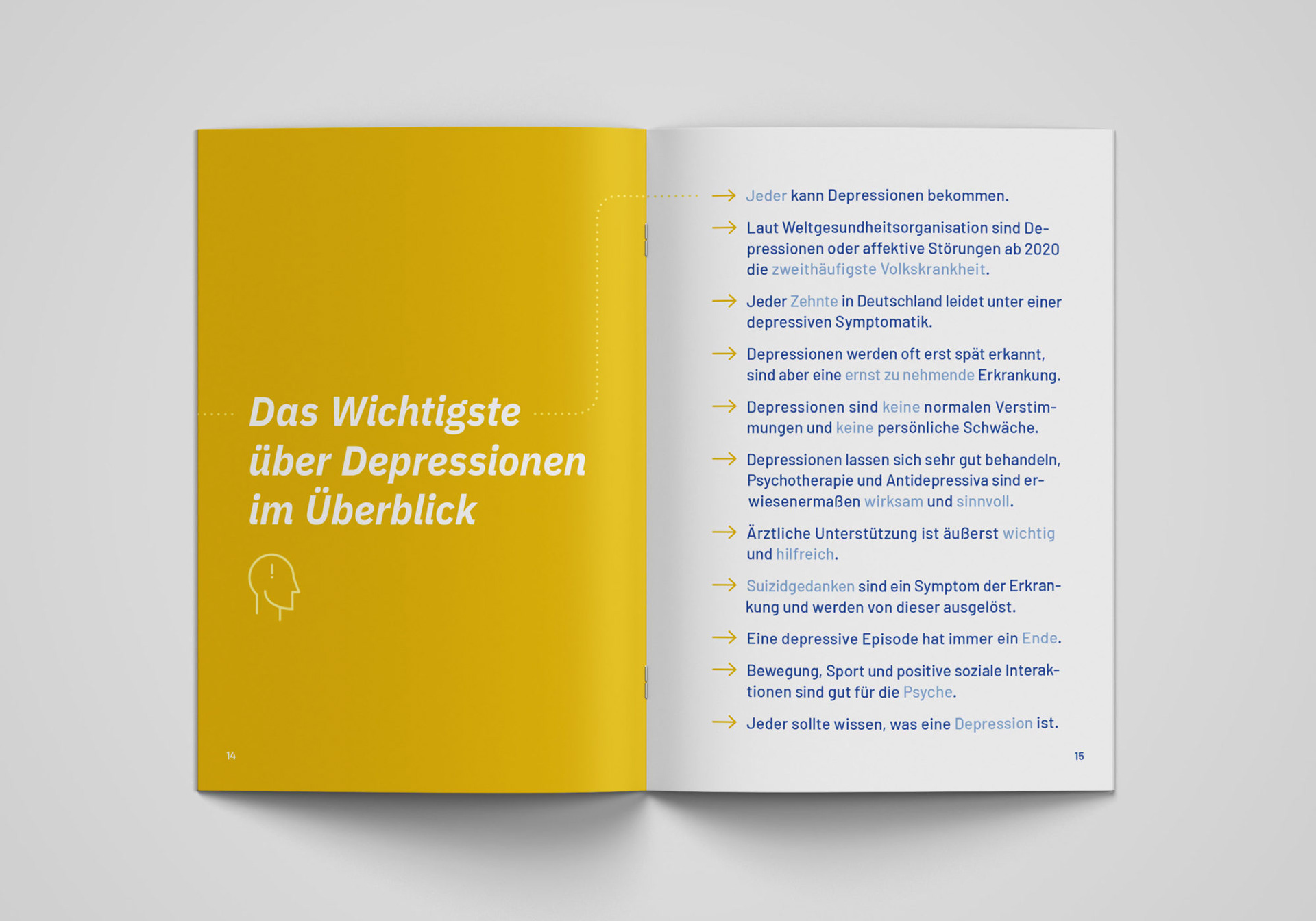 Obwohl Depressionen weit verbreitet sind, mangelt es noch immer an Aufklärung über diese psychische Erkrankung. Die Broschüre erläutert in zehn Schritten die wichtigsten Informationen zur Depression.