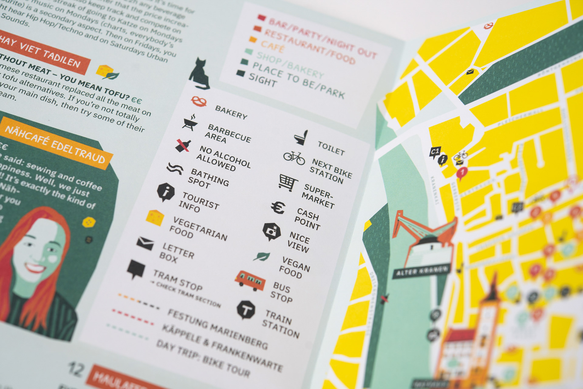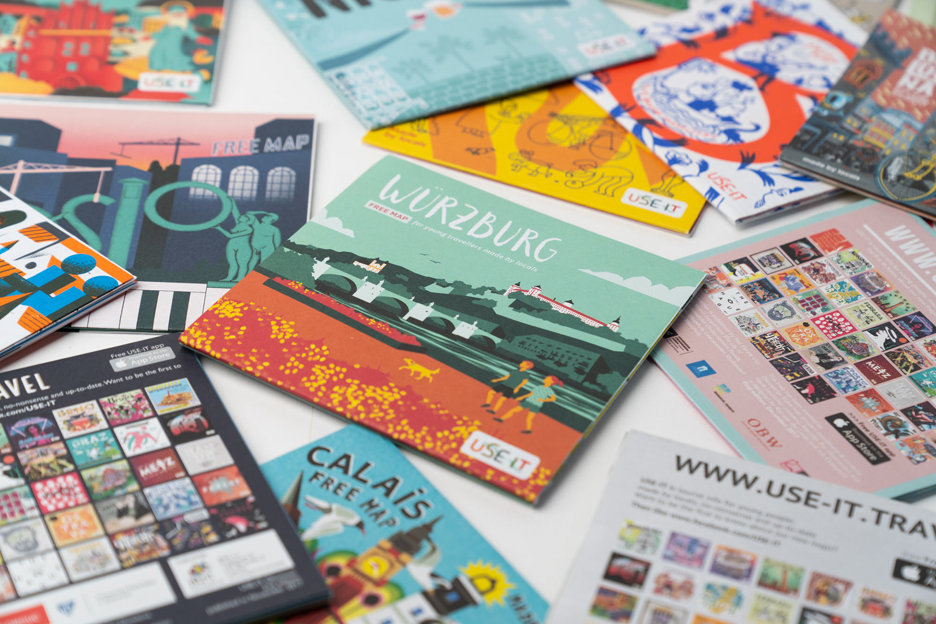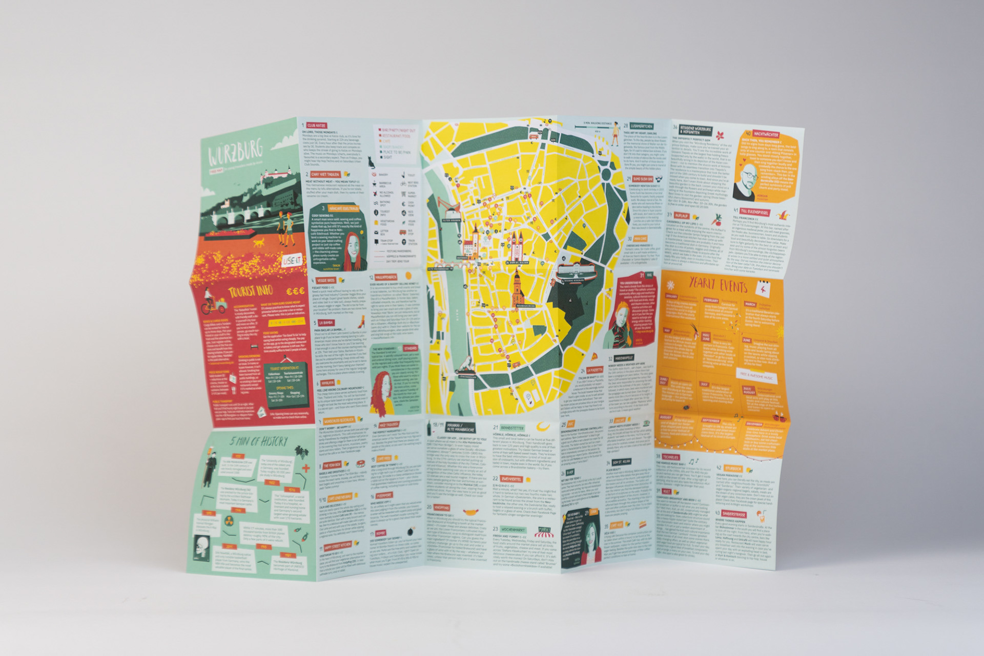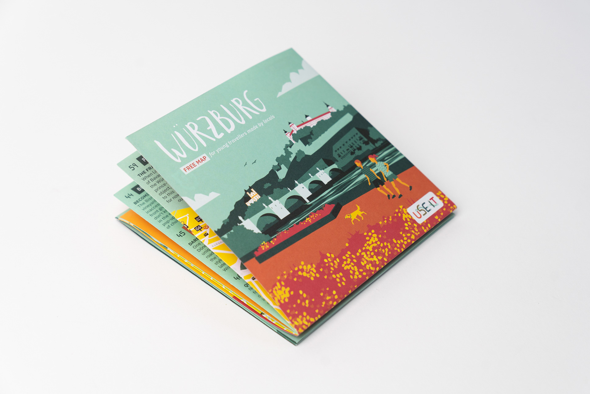 Konzeption und Design eines neuen, jungen Stadtplans für Würzburg. Diese Art der werbefreien und kostenlosen Karten werden unter der Organisation »USE-IT Europe« in verschiedenen Städten Europas eigenständig von Einheimischen erstellt. Die Karten richten sich an junge Tourist:innen, welche die Stadt auf humorvolle und charmante Art erkunden wollen.